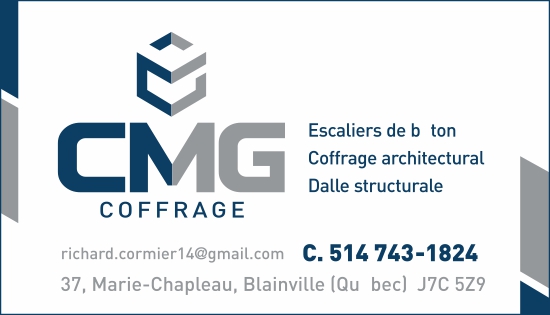Quels que soient vos projets ou besoins en terme de produits et services, vous trouverez en CMG COFFRAGE INC un partenaire de confiance reconnu pour son approche professionnelle et son efficacité. Nous sommes des experts en Coffrages - Coffreurs, .